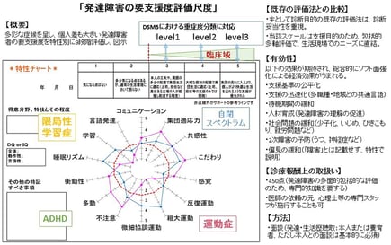 MSPAでは、当事者ばかりでなく家族や教師といった異なる立場の多様な支援者が特性の個人差を視覚的に理解できるよう、こだわり・睡眠リズム・反復行動といった要素を5段階でレーダーチャートに示しています(図1)。